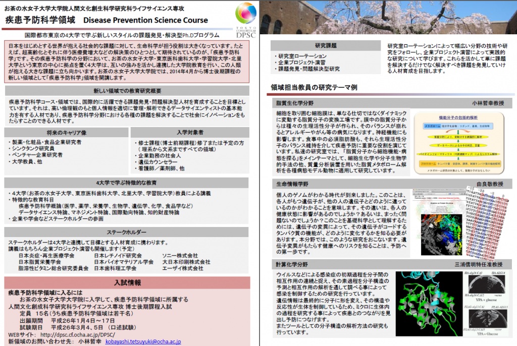 As part of the project, the Disease Prevention Science Department was newly added to the Division of Life Sciences doctoral program of the Graduate School of Humanities and Sciences in AY2013, with classes starting in April 2014.