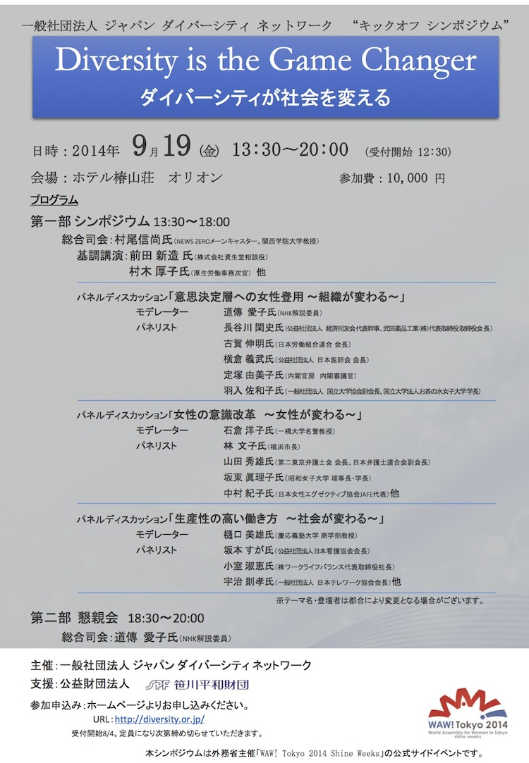 | 主催 | 一般社団法人 ジャパン ダイバーシティ ネットワーク http://diversity.or.jp/ |