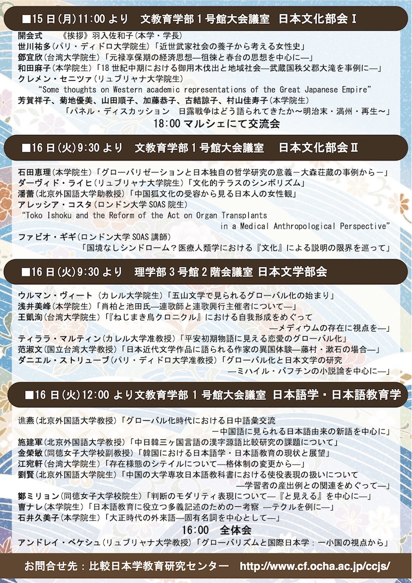 | 問合せ先 | 比較日本学教育研究センター(開室時間:火曜10:00〜17:00、水曜13:00〜17:00) TEL:03-5978-5504 E-mail: URL:http://www.cf.ocha.ac.jp/ccjs/ |
