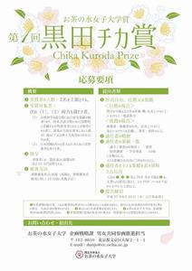 お茶の水女子大学は、故前田侯子名誉教授から本学への御寄附をもとに、黒田チカ博士の日本最初の女性化学者としての自然科学研究への貢献と業績を讃えると共に、若手女性研究者の活躍を願って、「黒田チカ賞」を設立しました。この賞は「お茶の水女子大学賞」の1つとして位置付けられています。