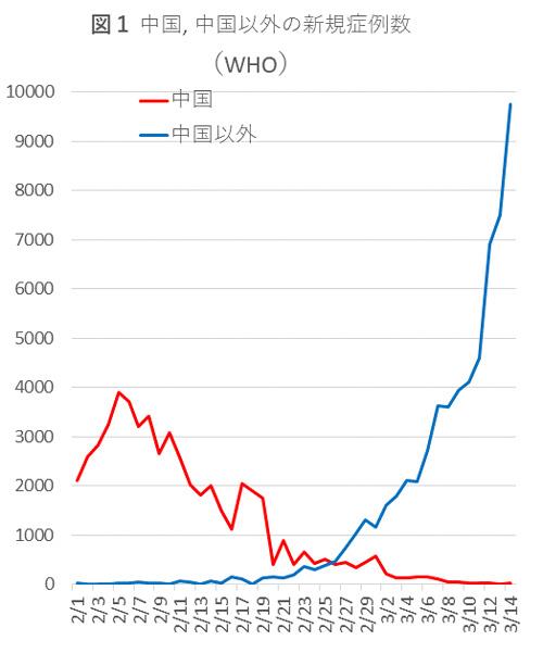 中国湖北省武漢市に端を発した新型コロナウイルス(SARS-CoV-2)による感染症、COVID-19は世界的に感染が拡大し、2020年3月14日現在WHOの発表では中国での確定診断例81.021例(56.8%)、その他の地域61.518例(43.2%)、中国での死亡例3,194例(死亡率3.9%)、その他の地域2,199例(死亡率3.6%)と報告され、図1の新症例数(確定診断症例数)の時経過(Epidemic curve)に見られるように中国での感染拡大は現在の封じ込め政策下においてはほぼ制圧され、感染の首座は中国以外の国、地域に移行しています。