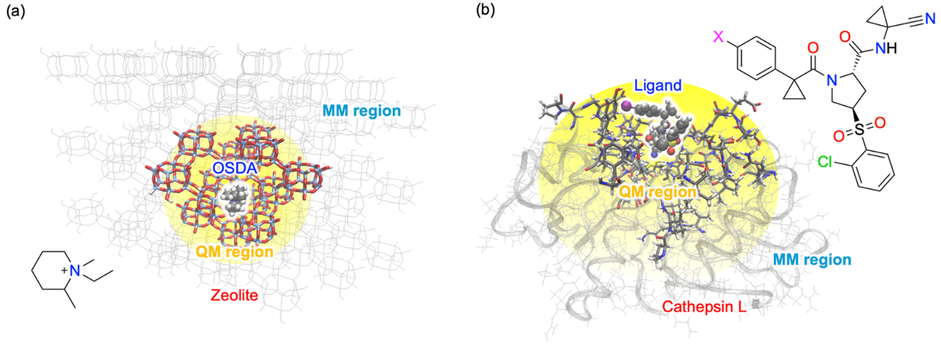 材料系(左:ゼオライトと構造規定剤の例)および生体分子系(右:酵素と阻害剤の例)では、分子間相互作用により電子状態が局所的に変化する。本研究では、長年にわたり QM/MM 計算が経験に依存せざるを得なかった原因である「重要領域の境界」を、電子状態応答を手がかりとして自動的に特定する新しい原理を示した。